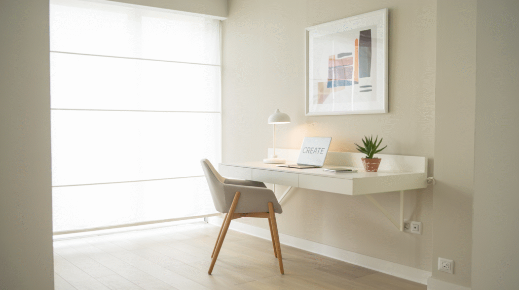 If you’re working from home or need a dedicated study corner, avoid bulky desks that overwhelm your space. Instead, opt for floating desks or wall-mounted fold-out tables.